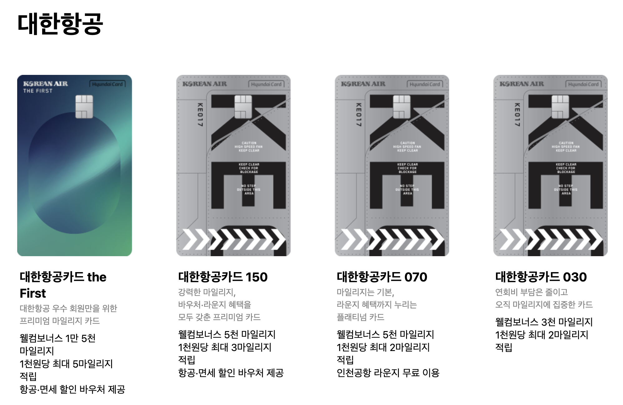 최근 현대카드에서는 대한항공과 연계하여 대한항공카드 시리즈를 출시했어요.