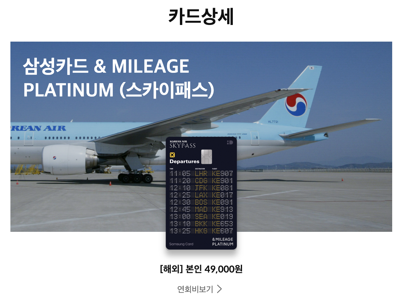 현대 대한항공카드와 쌍벽을 이루는 카드로 삼성카드 & MILEAGE PLATINUM (스카이패스)가 있어요.